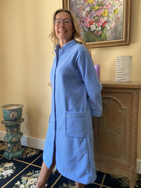 Robe de chambre polaire, col officier et revers manches finition biais satin